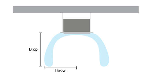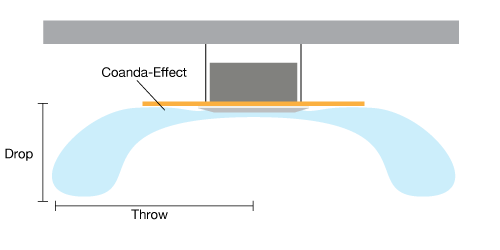 Het Coanda-effect is een natuurkundig fenomeen dat ervoor zorgt dat een luchtstroom zich aan een oppervlak “hecht” en erlangs volgt in plaats van direct naar beneden te vallen. Hierdoor kan de lucht zich gelijkmatig verspreiden en zacht mengen met de ruimtelucht, wat zorgt voor een comfortabele en tochtvrije temperatuurverdeling.
